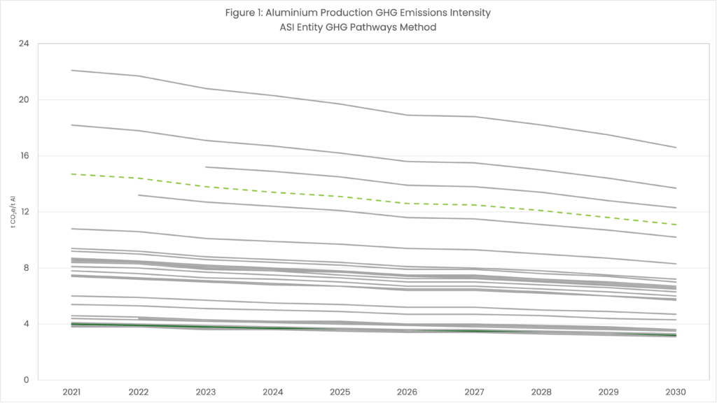 Baseline data were derived from publicly disclosed sources, where available, with a preference for 2021 as the baseline year. When 2021 data were not disclosed, as required for Entities under the ASI performance Standard V3, the closest available reporting year was used. When public disclosures were unavailable or incomplete, smelting process values were sourced from CRU Asset Services, with assumptions for upstream (predominantly alumina) processes, ranging from 1.3 to 2 t CO₂e/t Al, broadly depending on location and using ASI in-house intelligence.