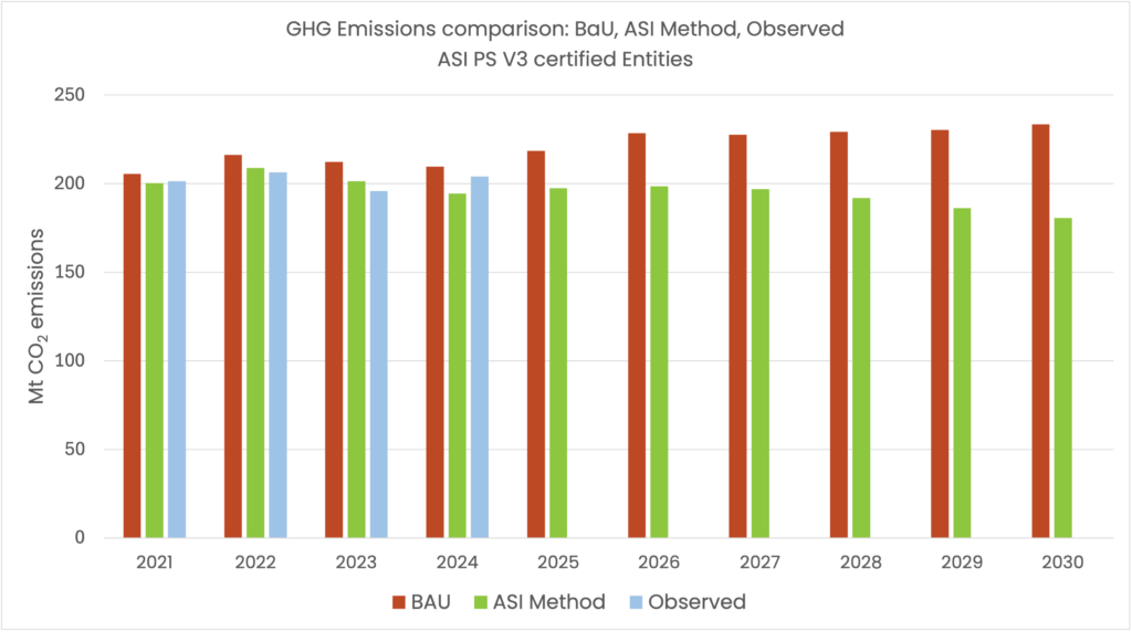 This analysis demonstrates that ASI Performance Standard disclosure requirements enable a level of transparency sufficient to quantify emissions trajectories and assess alignment with 1.5oC consistent pathways across ASI PS V3 certified Entities. The availability of emissions data and reduction targets make it possible to evaluate actual outcomes.